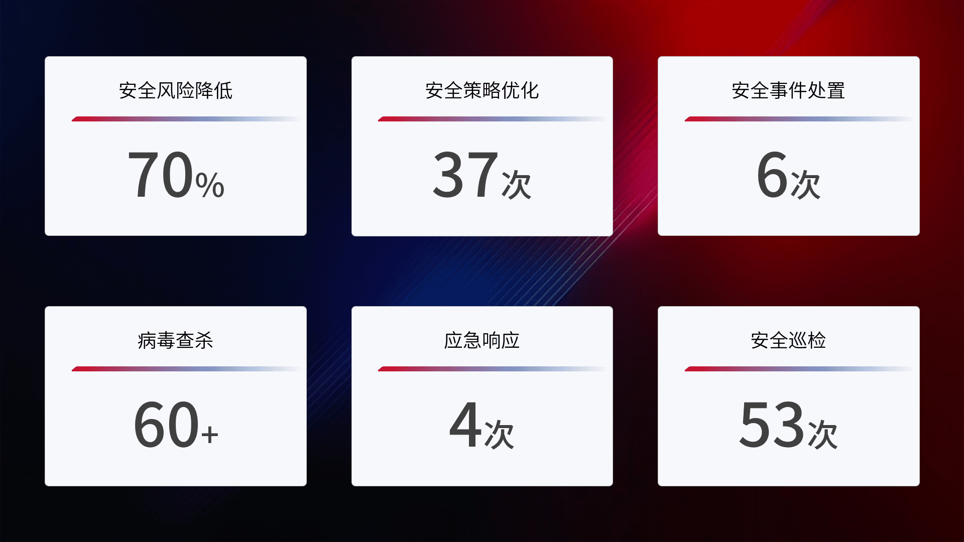 提供全面的安全事件报告体系,,包括处置报告、、、、周报、、、、季度和年度总结,,结合持续监控,,,帮助客户深入了解网络安全状况。。。