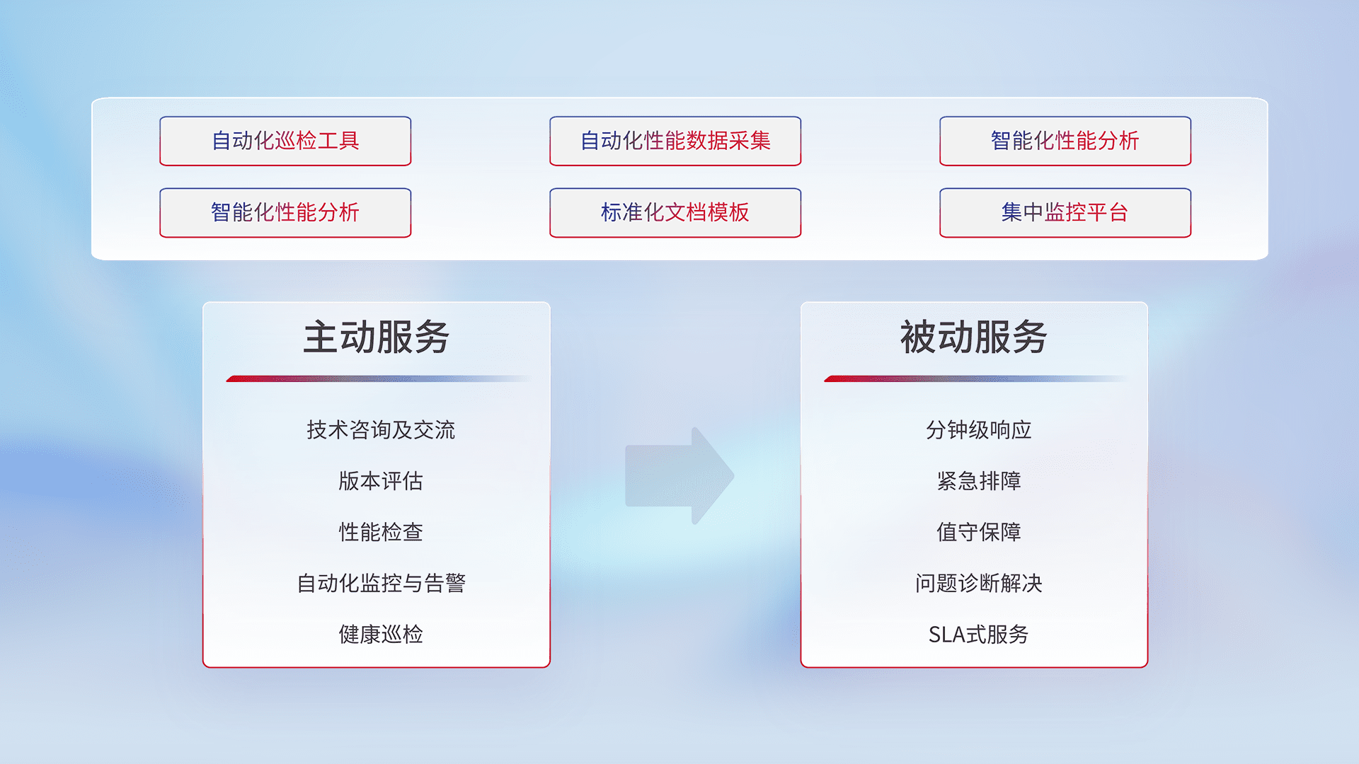 智能化工具和标准化文档,,,,保障服务质量,,,,提供主动服务(包含技术咨询、、、版本评估、、性能检查、、自动化监控与告警、、、健康巡检)和被动服务包含(分钟级响应、、紧急排障、、、、值守保障、、问题诊断解决、、、SLA服务)。。。