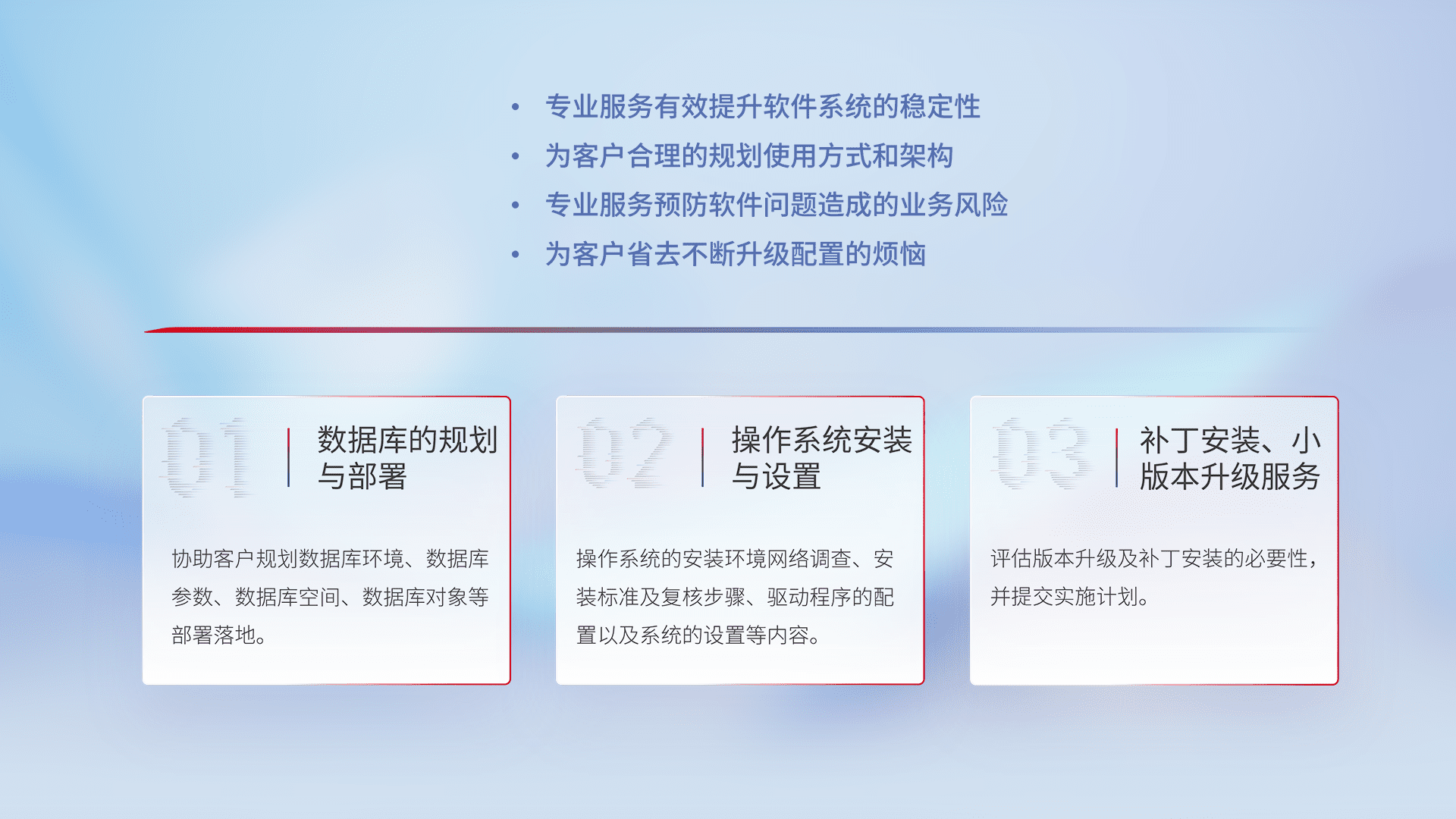为客户提供软件规模升级、、、快速部署、、、按需配置的专业服务,,,从数据库的规划与部署到操作系统的安装与设置,,再到补丁安装和小版本升级提供支持。。。。